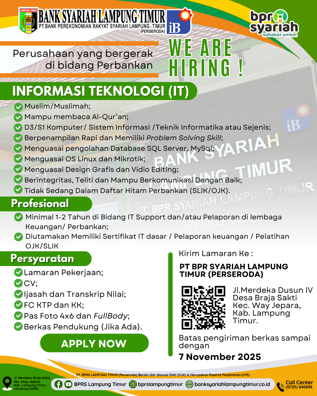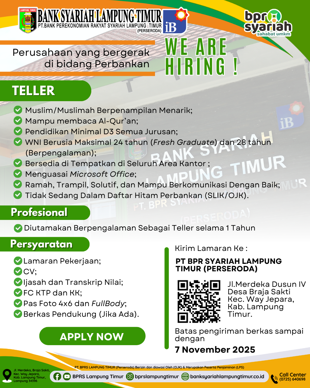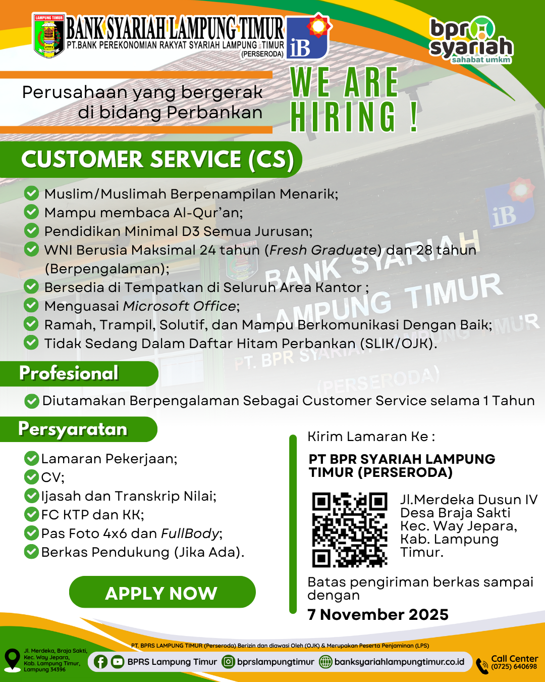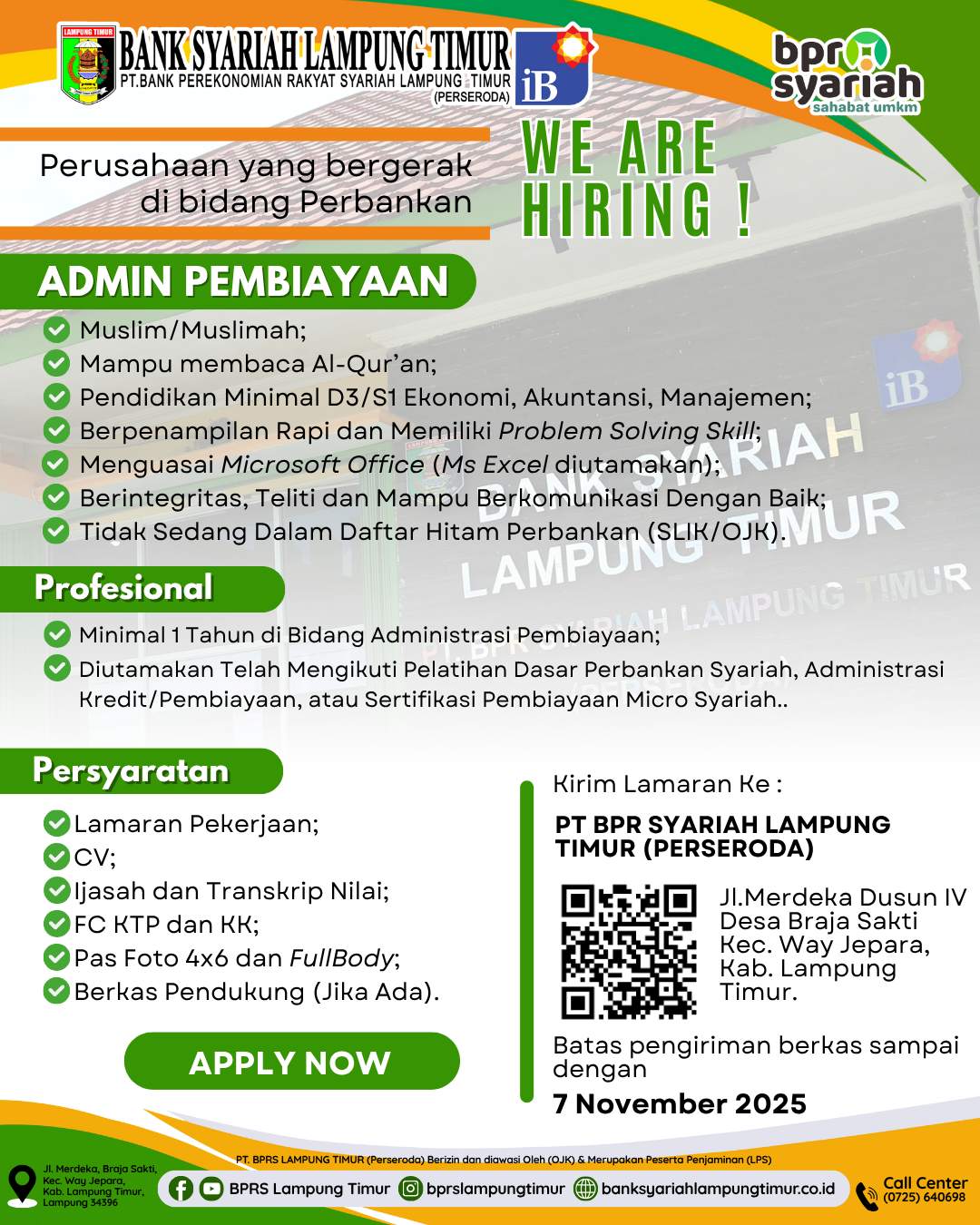 Bergabunglah bersama BPRS Lampung Timur (Perseroda) — menjadi bagian dari lembaga keuangan syariah yang amanah, profesional, dan berkomitmen membangun ekonomi masyarakat Lampung Timur.